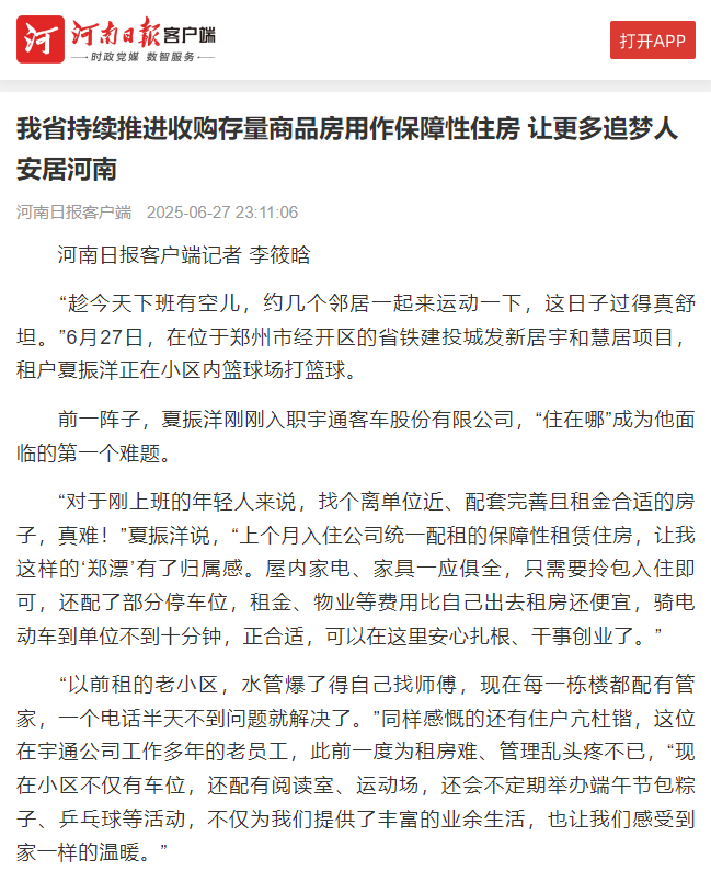 此前,省住房城鄉建設廳指導河南省鐵路建設投資集團有限公司、河南中豫建設投資集團股份有限公司分別注冊成立子公司,參與鄭州、洛陽的存量商品房收購工作。鄭州因地制宜開展商品住房“以舊換新”,通過國企收購存量房用作保障性住房、聯動開發企業和經紀機構推動居民換購新房,打通一二手房聯動轉化通道,更好滿足群眾多樣化改善需求。