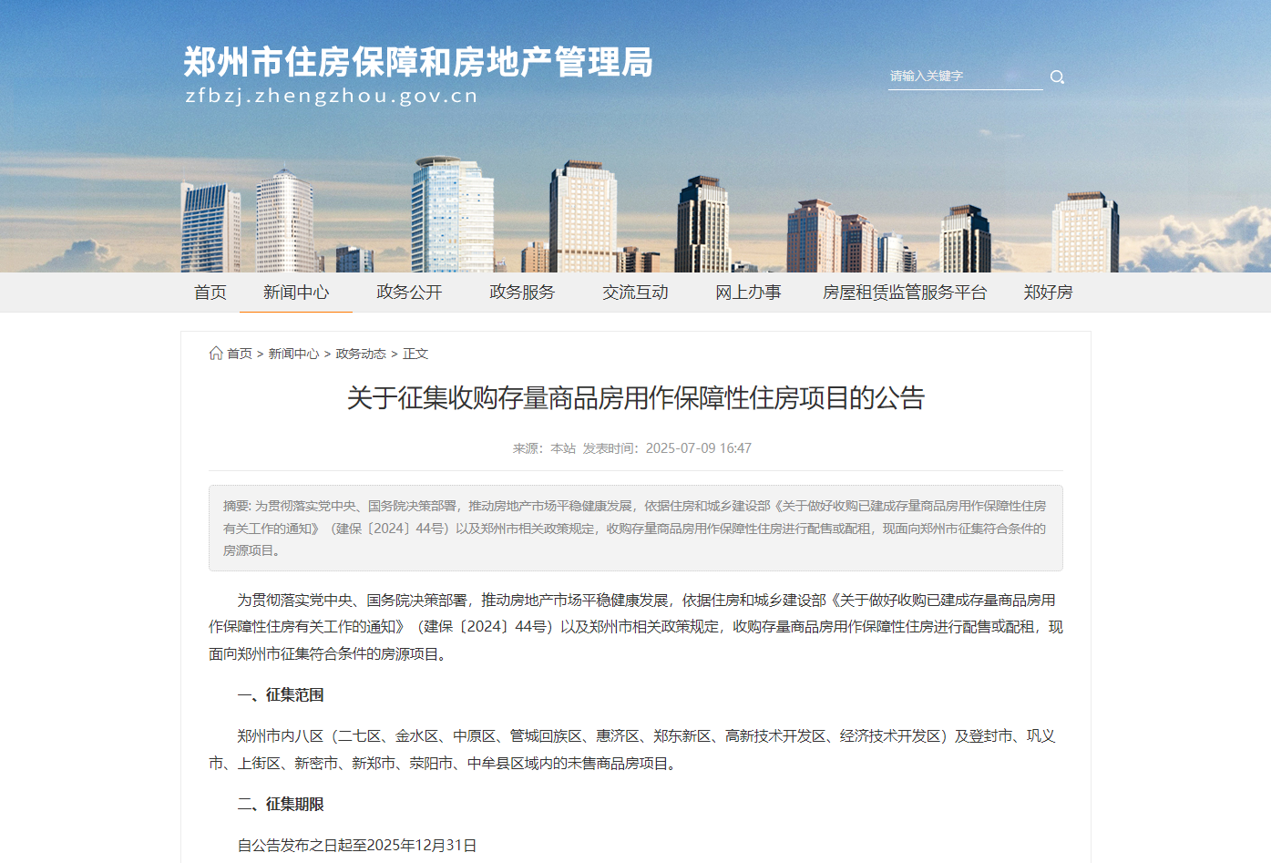 鄭州市住房保障和房地產管理局:關于征集收購存量商品房用作保障性住房項目的公告